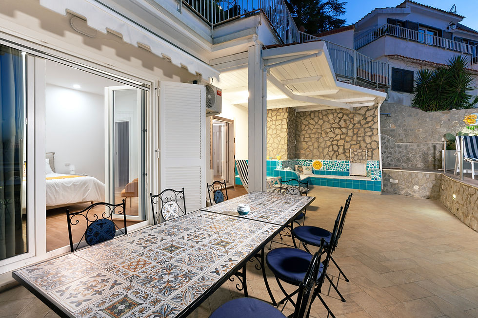 Le due terrazze panoramiche sono il vero cuore di Donna Giovanna, uno spazio dove il confine tra architettura e paesaggio svanisce. Dominate dal bianco e dall'azzurro, le terrazze ospitano il maestoso tavolo in maiolica artigianale, simbolo della tradizione sorrentina, dove potrete cenare all'aperto circondati dalla bellezza del Golfo.